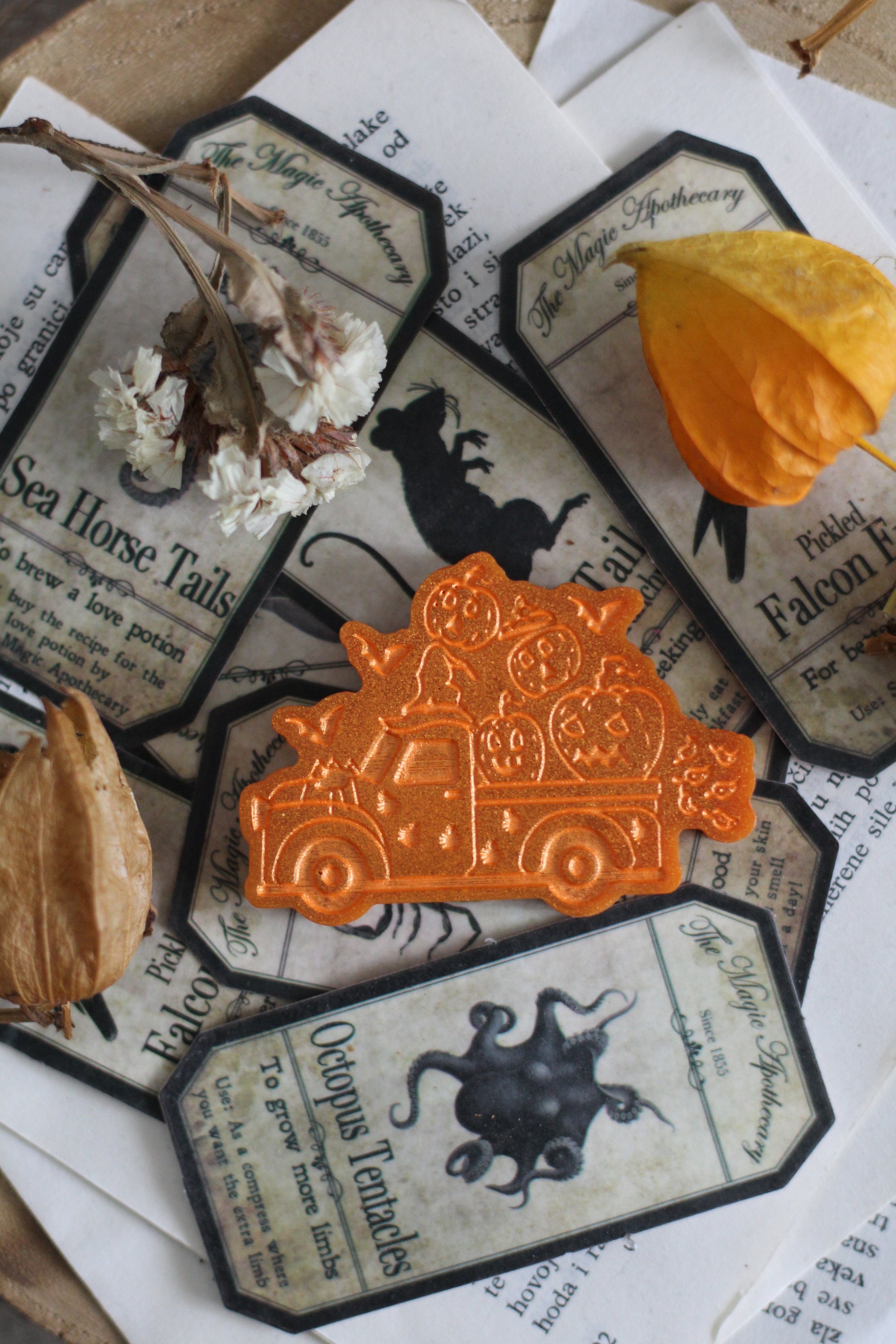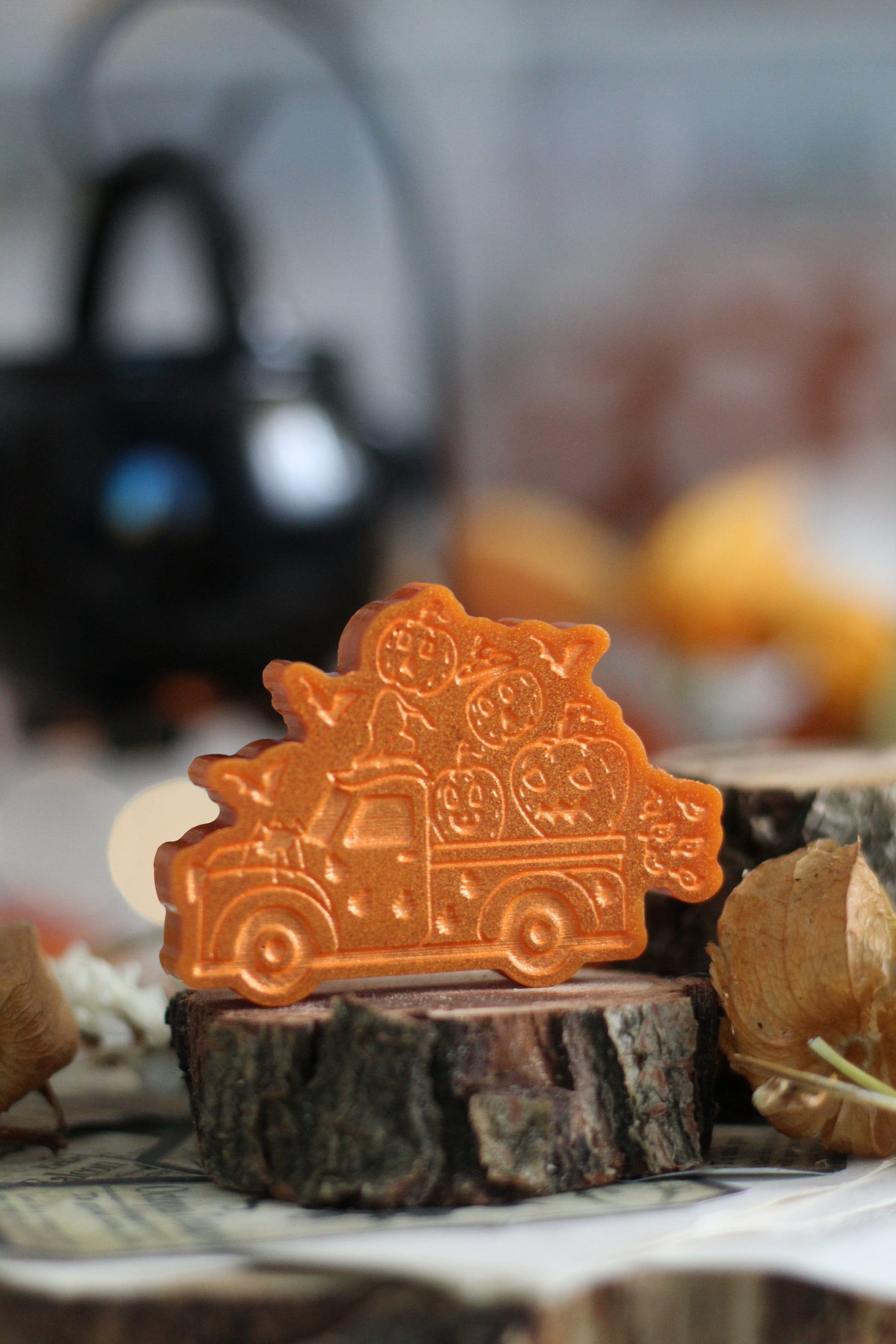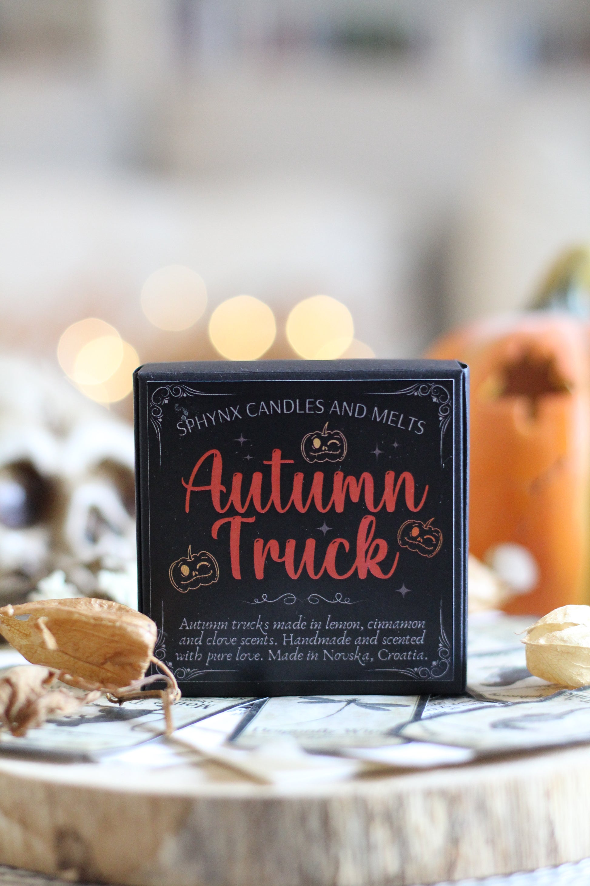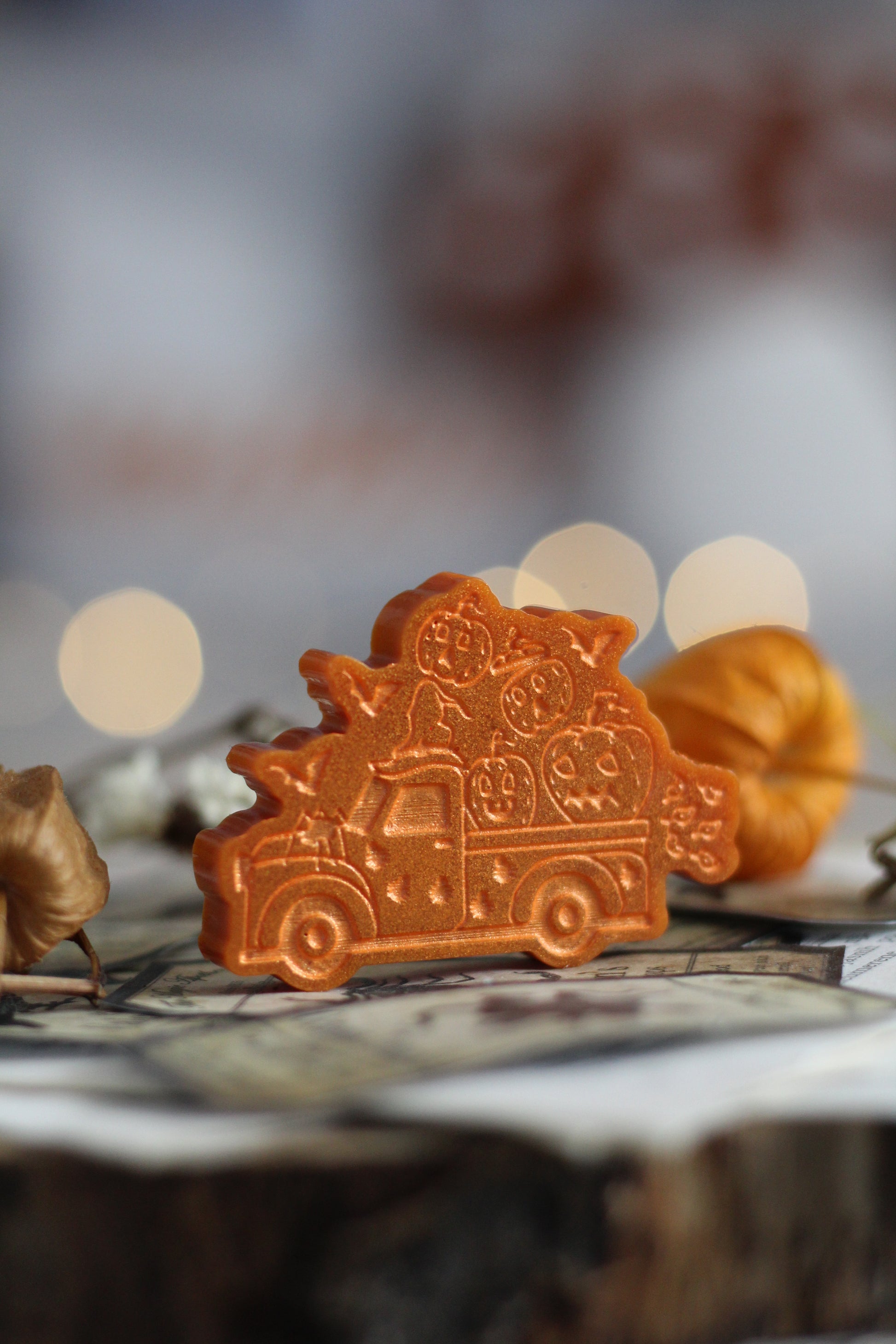 Autumn Truck vosak za topljenje dolazi u pakiranju od dva jesenska kamiončića koji su natovareni spooky bundevama. Voskovi su ručno bojani posebnom tehnikom bojanja mica prahom.