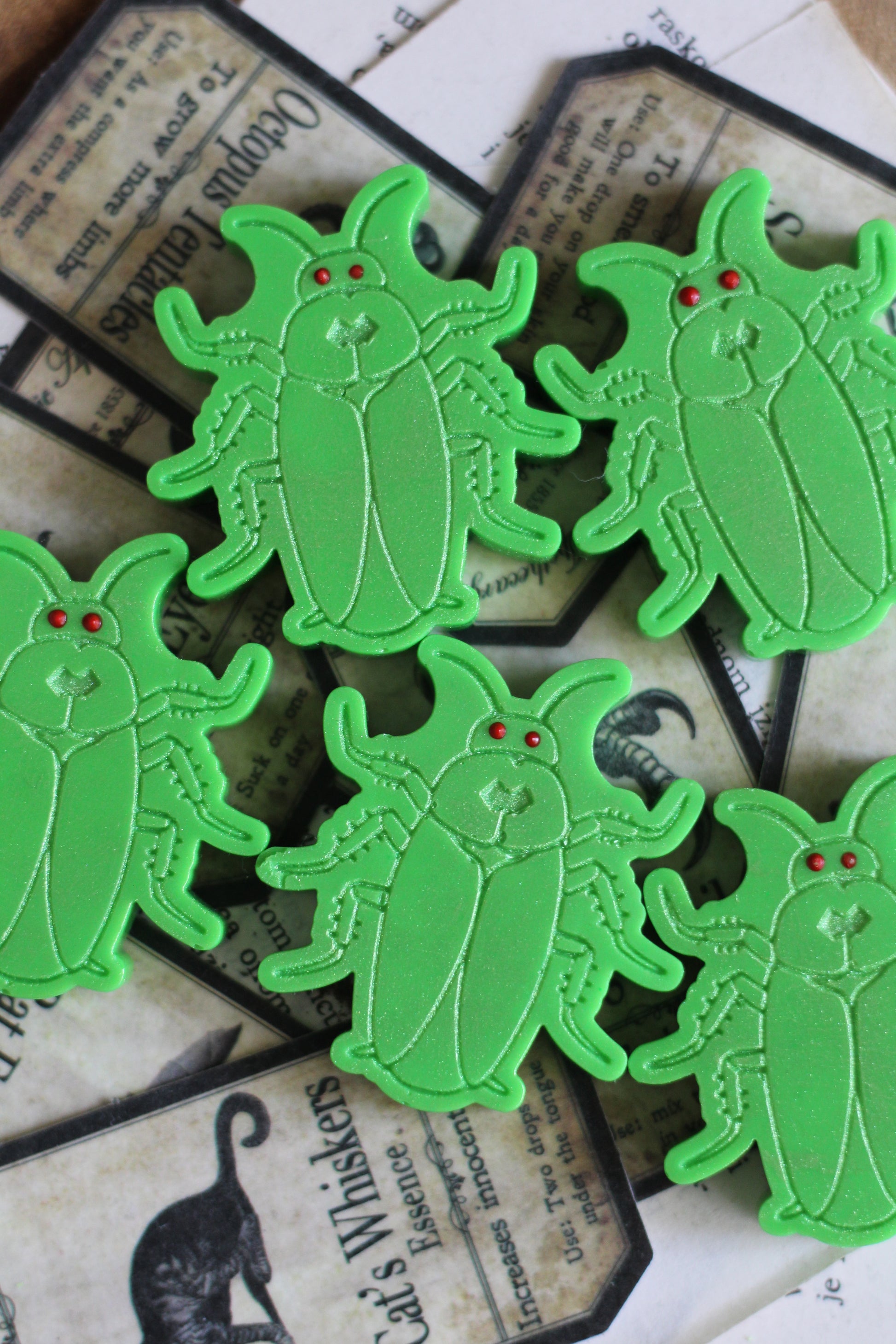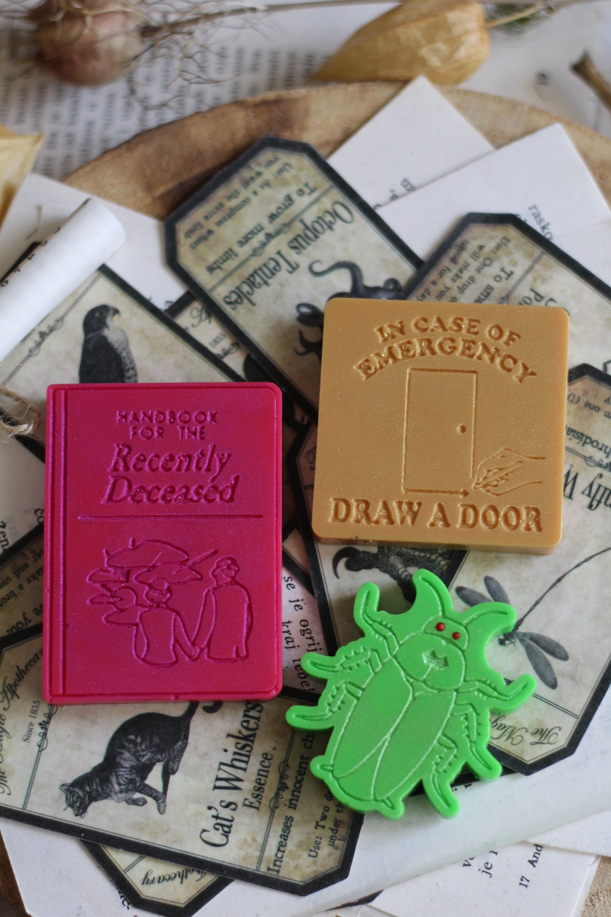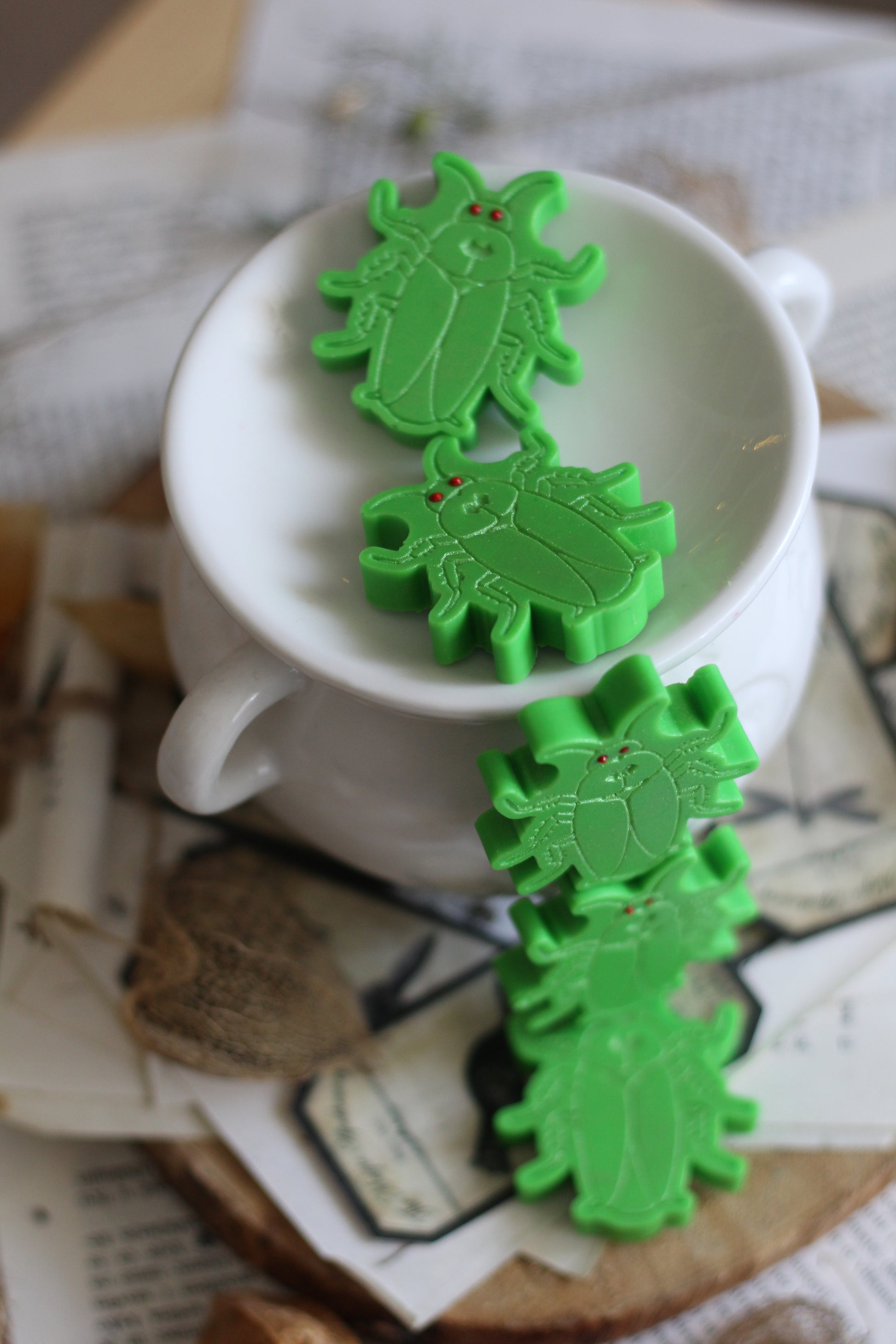 Voskovi su izrađeni ručno, ručno iscrtani i obojani, s pečatom od voska u koji je utisnuta buba.